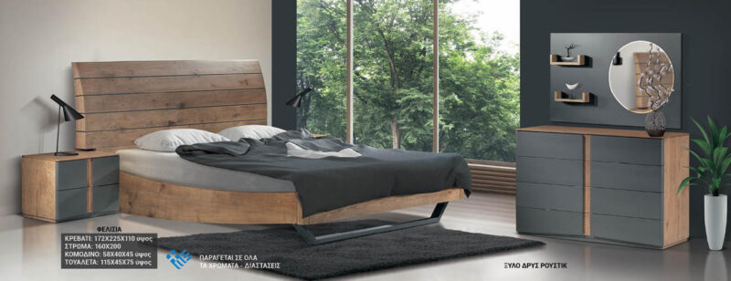 Μια κρεβατοκάμαρα που κατασκευάστηκε και σχεδιάστηκε γα να μαγνητίζει τα βλέμματα.Μασίφ κατασκευή από φυσικό δρυς ρουστίκ τέλεια βάση από μασίφ σίδερο με υπέροχο φινίρισμα από γκοφρέ βερνίκια σε γκρί απόχρωση.Τα χρώματα και οι διαστάσεις προσαρμόζονται στις ανάγκες του χώρου σας.
